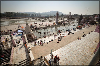 « des milliers de saints et de pélerins hindoux aussi bien adorateur de shiva que de Vishnou, affluent tout au long de l’année vers la « porte du grand fleuve », au débouché du gange dans la plaine, en quête d’un bain purificateur synonyme de salut et de vie éternelle. »