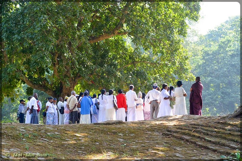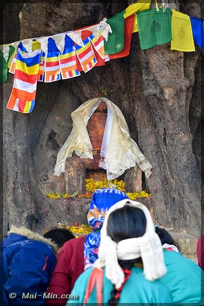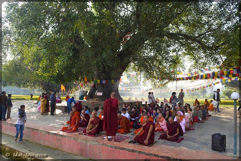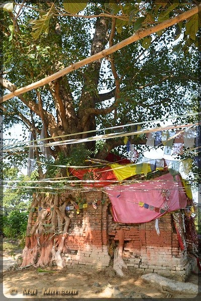 Juste devant le temple et le bassin sacré, l’arbre en question. Ce n’est pas l’original, il aurait été arraché mais celui ci abrite une pierre sculptée représentant la naissance de bouddha. Les pèlerins viennent s’y recueillir en masse. Tout autour de l’arbre, il y a des moines qui assistent l’office et qui reçoivent des dons au bon vouloir des gens.