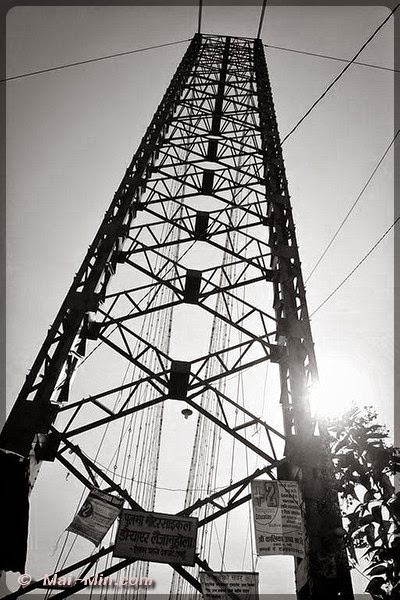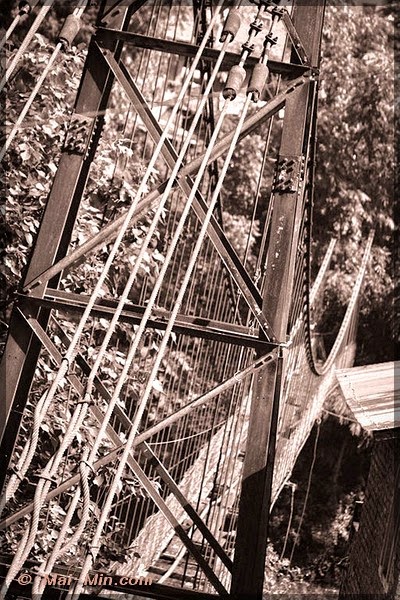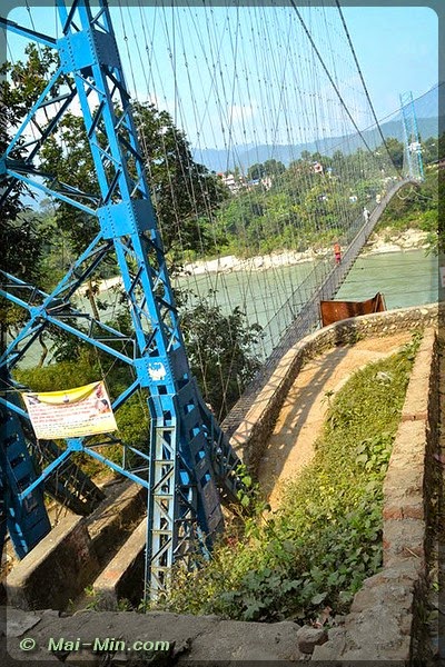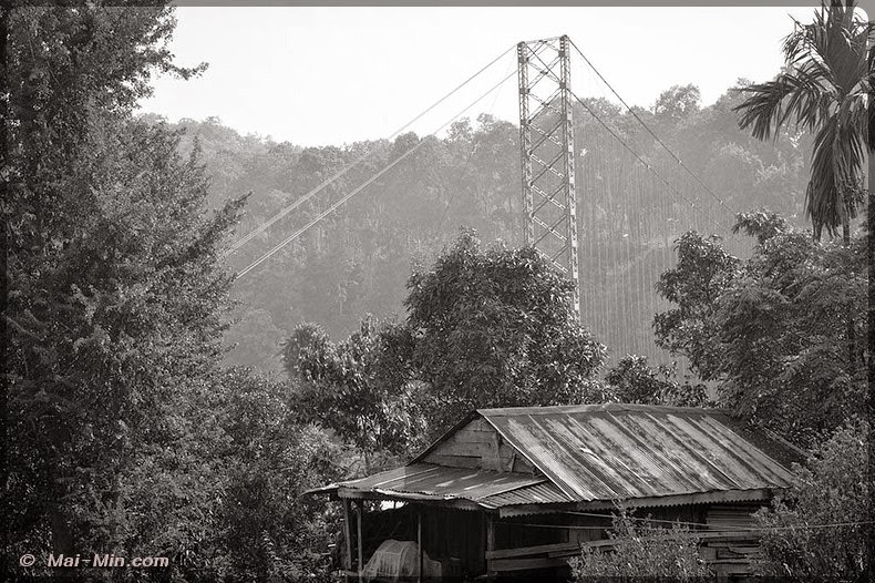 Un peu plus loin, à la fin du site, il y a un pont suspendu ou plutôt un pont d’équilibriste qui traverse la rivière/fleuve. J’attends, j’observe et je vois que les deux roues s’engagent, et pourquoi pas moi ? Maaaaaaaaaaaaaaa fois