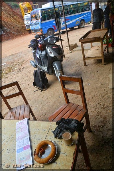 A la gare routière, la pause déjeuné ‘thali » c’est imposé dans une gargote bien du cru et puis je m’en suis retourné le bide copieusement gonflé de riz & Cie en espérant que cela n’handicapera pas les capacités du petit scooter pour remonter tout la haut, avec ce trajet bien pentu.
