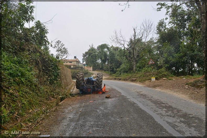 La route est dans un bon état général, pas trop de surprise mise à part ce tracteur qui a du glisser de la piste sur le dessus, j’espère qu’il n’y a pas eu trop de bobo pour le chauffeur ?